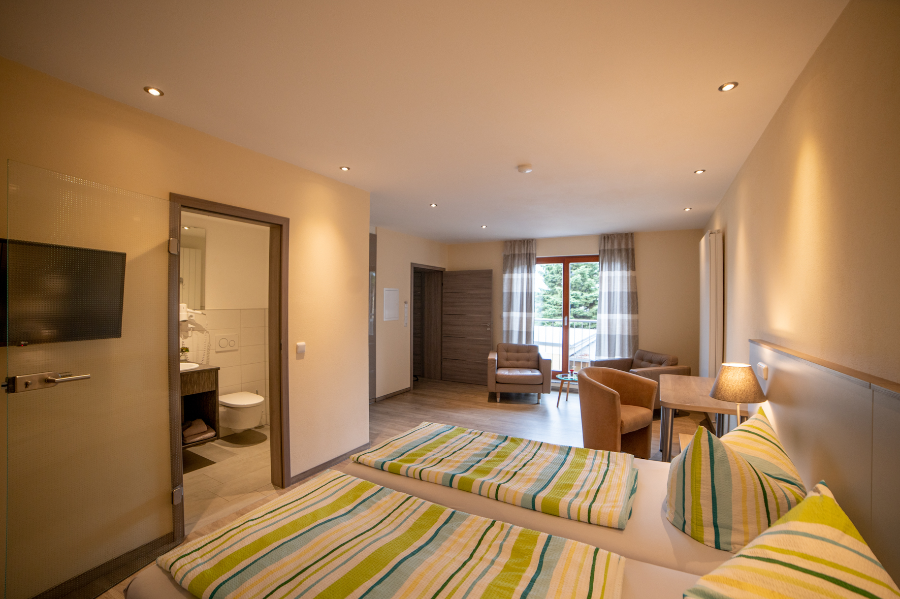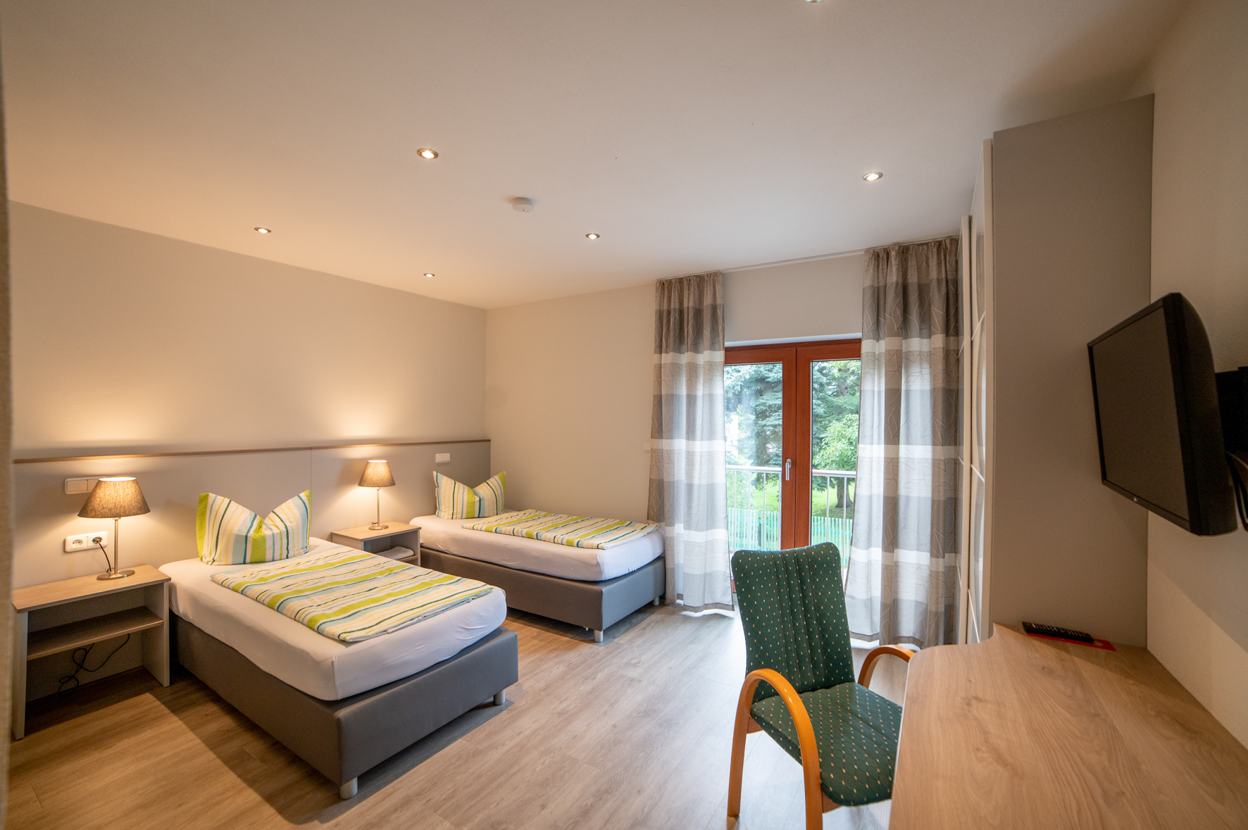 Im Neubau des Hauses befinden sich mehrere Zimmer, die durch Änderung der Möblierung auch als Zweibettzimmer oder Einzelzimmer genutzt werden können.