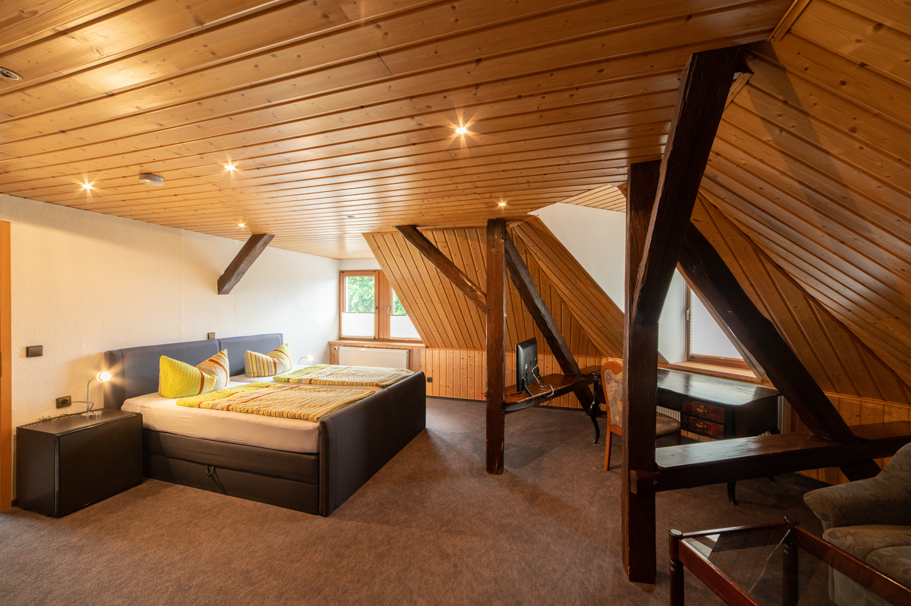 Im Altbau des Hauses im Obergeschoss befinden sich zwei Doppelzimmer und ein Zweibettzimmer.